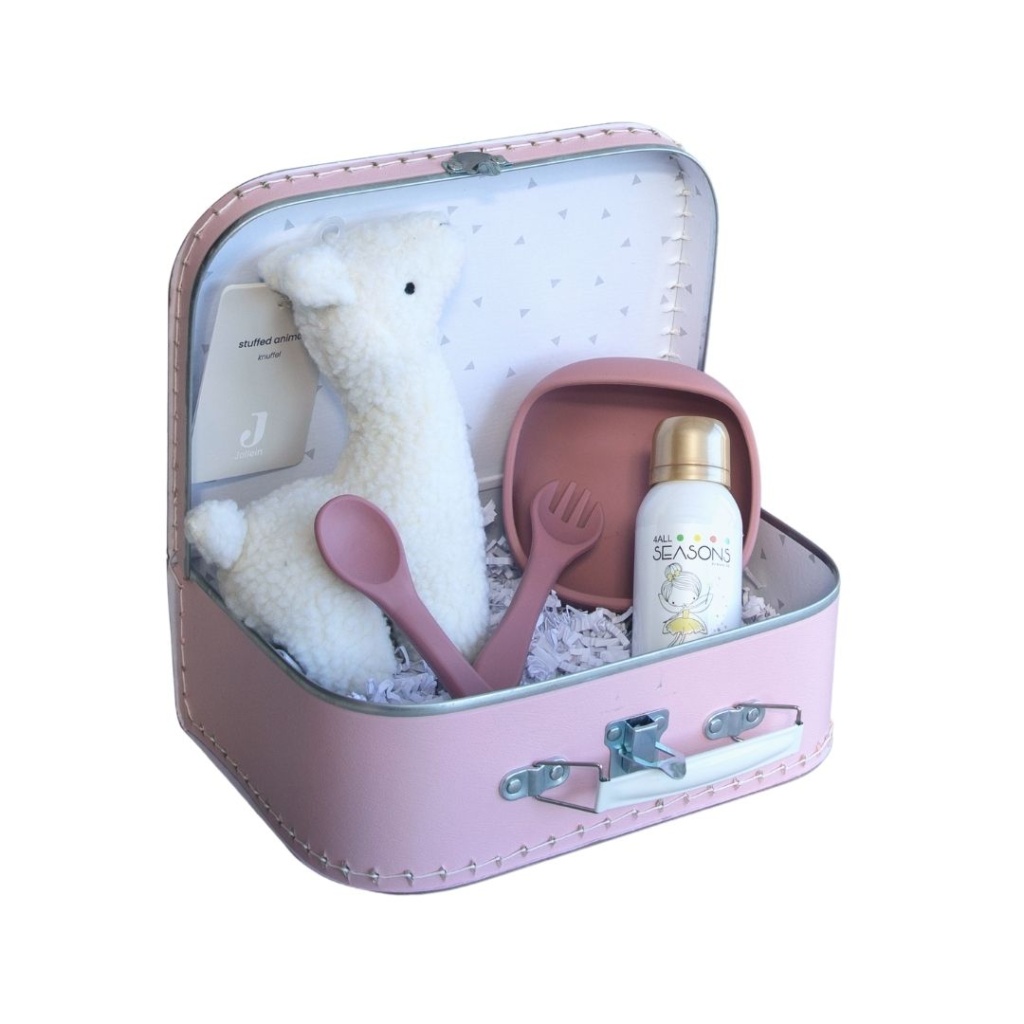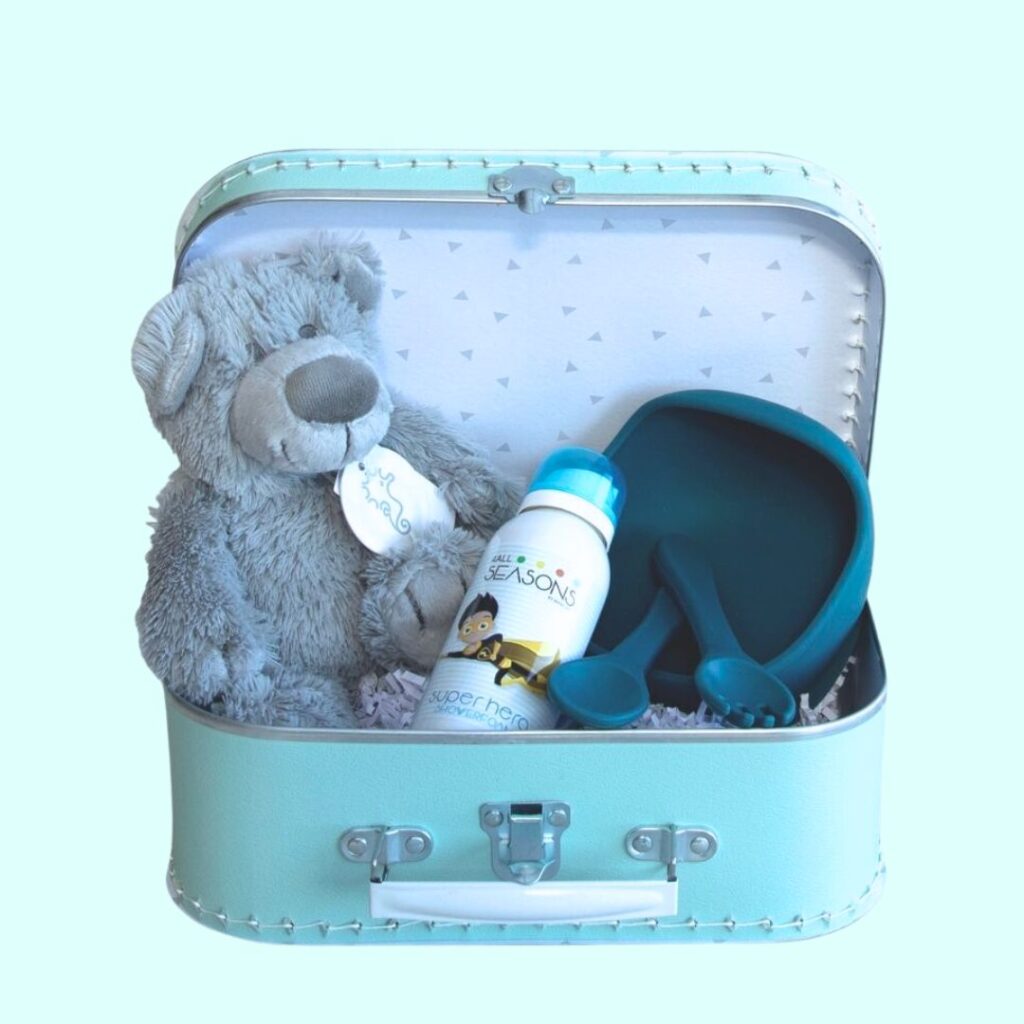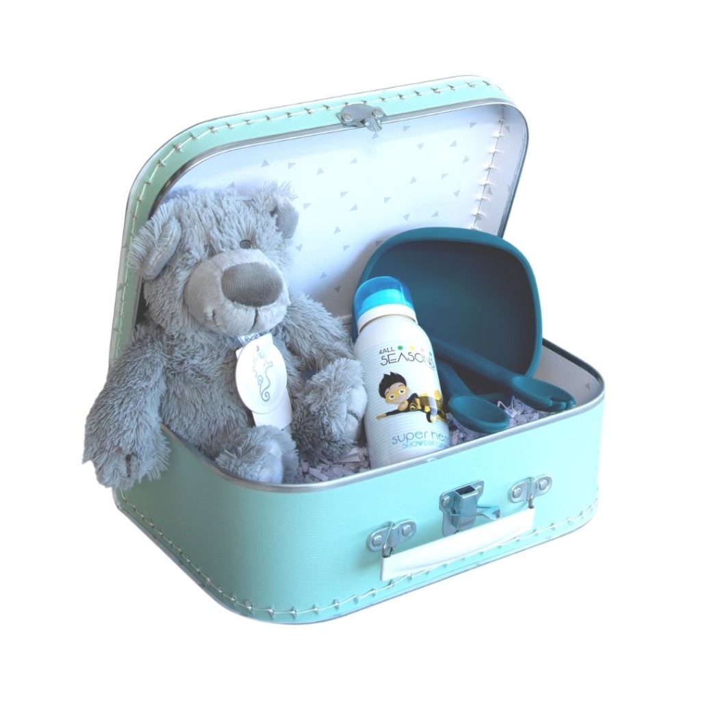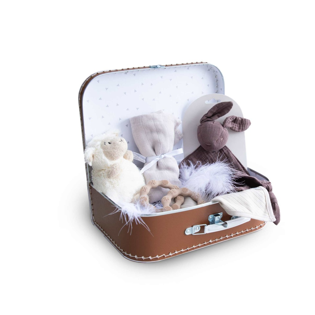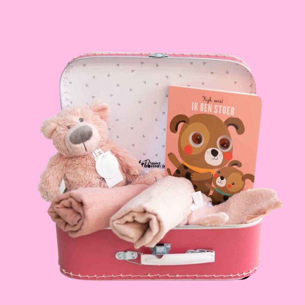 gevuld met babyproducten, een geschenkset voor mama of papa, koffertjes voor grootouders en meter & peter.